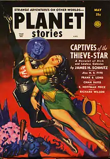 Schmitz was decades ahead of the curve in his portrayal of female characters—years before the Women's Movement of the '70s would come along to raise the consciousness of SF writers (or attempt to), Schmitz was not only frequently using women as the heroines in swashbuckling tales of interplanetary adventure—itself almost unheard of at the time—but he was also treating them as the total equal of the male characters, every bit as competent and brave and smart (and ruthless, when needs be), without saddling them with any of the "female weaknesses"—like an inclination to faint or cower under extreme duress, and/or seek protection behind the muscular frame of the Tough Male Hero) that would mar the characterization of women by some writers for years to come. (The Schmitz Woman, for instance, is every bit as tough and competent as the Heinlein Woman—who, to be fair, isn't prone to fainting in a crisis either—but without her annoying tendency to think that nothing in the universe is as important as marrying Her Man and settling down to have as many babies as possible.)[6]