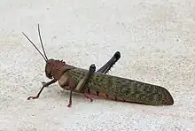 Tropidacris cristata, the giant red-winged grasshopper, is a widespread species of lubber grasshopper in the family Romaleidae from tropical South and Central America, and Mexico.[1][2][3] It is among the largest grasshoppers in the world by length and wingspan, reaching up to 14.5 cm (5.7 in) and 24 cm (9.4 in) respectively.[4][5] More typical adult lengths are 5.5–7 cm (2.2–2.8 in), average 6.5 cm (2.6 in), in males and 7–12 cm (2.8–4.7 in), average 11 cm (4.3 in), in females.[6][7] As suggested by the common name, adult T. cristata have conspicuously red wings in flight, although the exact red hue varies.[6] The flightless and gregarious nymphs have aposematic dark-and-yellow stripes and are presumed to be toxic.[5][7]