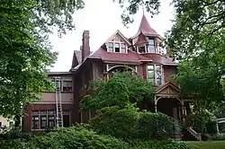 The Turner-Ledbetter House is a historic house at 1700 South Louisiana Street in Little Rock, Arkansas. It is a two-story wood-frame structure, its exterior mostly finished in brick, with a hip roof and a variety of dormers, projections, porches, and decorative elements typical of the Queen Anne period of architecture. Notable features include a three-story turret with flared conical roof, an entry porch with turned posts, bracketing, and a spindled balustrade, and windows with stone sills. The house was built in 1891-92 for Susan Turner, and was given additional Craftsman styling during renovations in the early decades of the 20th century.[2]