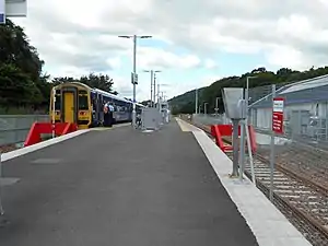 The station design uses a central platform with a line on either side. There is a 235-space car parking with 13 accessible spaces. There is a cafe and an accessible toilet which is only open when the cafe is open. There are waiting shelters on the platform. Bike racks are also provided at the station.[4]