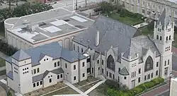 The Tyrrell Historical Library is a public library in Beaumont, Texas. Originally built in 1903 to serve as the First Baptist Church, the building displays a mix of Richardsonian Romanesque and Victorian Gothic architectures, with pointed arch windows and quatrefoils, and all of its original stained glass. The building became vacant in 1923 when the congregation moved to a new location. It was bought by Captain W. C. Tyrrell, who donated the building to the city for use as its first public library. The building is listed in the National Register of Historic Places and also as a Recorded Texas Historic Landmark.[2][3] It is also a contributing property to the Downtown Historic District.