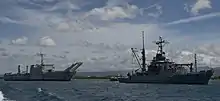 Tuscaloosa was then assigned to Operation New Life, escorting 26 former Republic of Vietnam Navy ships to the Philippines. During the passage, the LST's efforts in resupply earned Tuscaloosa a Meritorious Unit Commendation. In addition, parties from the ship were sent to salvage and repair various Vietnamese ships. Two Vietnamese craft were evacuated and sunk by gunfire from Tuscaloosa to eliminate possible hazards to navigation. In addition, four Vietnamese craft were temporarily taken over by the United States Navy and placed under the command of four officers from Tuscaloosa. The LST earned four battle stars for service during the Vietnam War.[10]