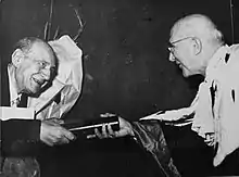 In 1919, he returned to Trieste and purchased the Mailänder second-hand bookshop, which he renamed La Libreria Antica e Moderna. The business produced enough income to support the family, and Saba soon became enthusiastic about buying and selling rare old books and enjoyed the extensive travel involved. After both returned to Trieste in 1919, Saba started meeting on a daily basis and collaborating artistically with Giotti, who designed for him the logo of the Libreria Antica e Moderna, edited and illustrated the plaquette for Saba's Cose leggere e vaganti and of ten small books. Saba on the other hand published Il mio cuore e la mia casa at his library.[5][2] After the death of Giotti's sister in 1929, his friendship with Saba deteriorated in the 1930s, up to the point when the two even avoided meeting.[5]