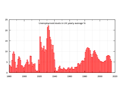 Data available from 1881 to 1912 is based on the records of trade unions that paid unemployment benefit to their members. In 1912 there were 1.4 million members of trade unions that paid benefits. This means the unemployment rates for this period are based on a very small section of the UK population at the time (mainly manual workers). The lowest unemployment rate recorded in this period was 1.4% in 1890 and the highest was 10.2% in 1892.[16]