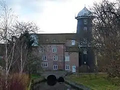 In 1896, the mills had a steam engine as auxiliary power. This had been replaced by a gas engine by 1925.[2] In May 1935, the mill tower was burnt out in a fire. The tower was refitted, and the former conical roof replaced with two cowled ventilators.[3] An oil engine was the auxiliary power source in 1937. On 1 February 1953, the mills were flooded to a depth of 7 feet (2.13 m). The mills were still in use at this time but had ceased working by 1969. In 1999 the mills were purchased for conversion. A new ogee cap was constructed and fitted to the windmill tower.[2]