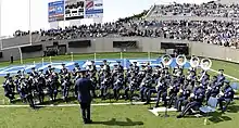 The United States Air Force Academy Band is a United States military band based out of Peterson Space Force Base near Colorado Springs, Colorado.[1] Despite the fact that it provides musical support to the USAFA Cadet Wing, it is an active duty full time band.[3] The USAFA Drum and Bugle Corps on the other hand is staffed by cadets of the academy. The band, like many other USAF bands, performs in a distinctive ceremonial dress, which includes a choker-style collar, and silver-braided epaulettes. It is one of two premier ensembles in the air force, with the other being the United States Air Force Band. The band was raised in 1955, shortly after the foundation of the academy.[4][5][6]