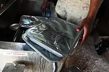 The Unitized Group Ration – Express (UGR-E or UGR-Express), nicknamed the "kitchen in a carton", consists of meals in self-heating steam table trays based on the UGR-H&S meal offerings. The UGR-E is designed to provide hot meals where feeding a group with hot food would otherwise be unfeasible; unlike other UGRs, it uses a flameless ration heater and does not require a separate field kitchen. The UGR-E begins heating with the pull of a tab, and can fully heat a meal within 30 to 45 minutes. The UGR-E has an offering of 4 breakfast menus, 8 lunch/dinner menus, and 1 holiday menu; each meal provides an average of 1,300 kcal. Each UGR-E module contains 18 meals, with each pallet holding 400 meals. UGR-E modules have a minimum shelf life of 18 months at 80 °F (26.6 °C).[14][16][17]