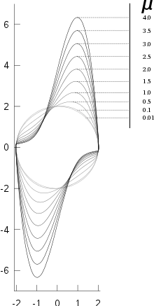 where x is the position coordinate—which is a function of the time t—and μ is a scalar parameter indicating the nonlinearity and the strength of the damping.