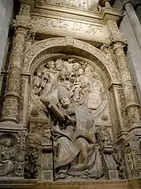 His most important work is the tomb with Alonso Fernandez de Madrigal (1518) made of alabaster. Alonso de Madrigal, a leading humanist, is represented in the act of writing on a lectern. At the base of the sculpture are represented virtues and over, on a large circular relief, the Adoration of the Magi. Above, on the frieze shows the cavalcade of the Magi and, topping the composition, the Nativity. In the four side panels, framed by richly ornate and simple cover, the four evangelists in the act of writing, there are over roundels with representations of saints and, above them, several scenes from the life of Christ. His latest work documented in Ávila in 1522, is the tabernacle of the main altar, carved in alabaster, with scenes of the Passion. He also attributed the tomb of Hernán Núñez de Arnalte, treasurer of the Catholic Monarchs, Santo Tomas de Avila and many other works in Ávila and other nearby locations.