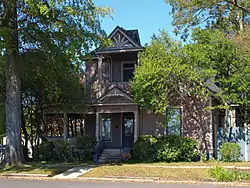 The Vaught House (also known as the Nicholson House) is a historic residence in Huntsville, Alabama. It was built in 1900 in what was then the East Huntsville Addition, a suburb made up primarily of company houses for nearby cotton mills. Its Victorian architecture style set it apart from its more modest bungalow neighbors. The house has an irregular plan, and its hipped roof features several dormers and gables. Centered on the façade is a single-story pedimented portico leading to the main entrance, and above it is a small pedimented balcony accessed from the upstairs bedroom. Both pediments are decorated with jigsawed designs. Both doors on the front feature rectangular transoms. A curved porch runs from the main portico around the southwest corner of the house; it originally featured Stick-Eastlake style frieze and balustrade, but was later replaced with a solid frieze and closely spaced rectangular balusters.[2] The house was listed on the National Register of Historic Places in 1981. It is included in the Five Points Historic District, which was listed on the National Register in 2012.[1]