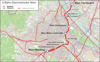 In the Vienna S-Bahn network, the Stammstrecke begins at Wien Meidling, continues through Wien Praterstern, and terminates at Wien Floridsdorf on the North railway line, 4.2 kilometres (2.6 mi) north of Wien Praterstern.[2][1] Services operating over this route include the S1, S2, S3, S4 and S7.[3]