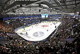 The arena was officially inaugurated on 17 September 2011, in an ice hockey game between Växjö Lakers and Linköpings HC. The arena tickets for the game were outsold within just one hour, with the Lakers' marketing manager speculating that they could have sold out two arenas.[7] Former Växjö Lakers crowd favorite Shjon Podein watched the game live in the arena. Linköping won the game 4–2 in front of 5,502 spectators.[8][9] However, the Lakers' premier game on 13 September, on away ice against Frölunda HC, was shown on the Vida Arena's Jumbotron in front of 2,400 spectators, with free entrance, as a preview of the Vida Arena experience and a test of the arena's technical features. Frölunda won the game 2–0.[10][11][12]