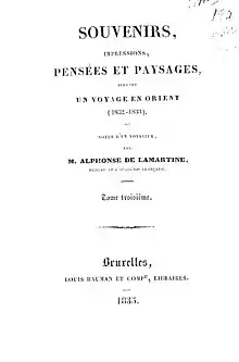Impressions, souvenirs, pensées et paysages pendant un voyage en Orient, 1832–1833, ou Notes d'un voyageur, shortened to Voyage en Orient, is a travel journal written by Alphonse de Lamartine. This book narrates Lamartine's journey to several Middle Eastern regions now known as Turkey, Lebanon, Israel, and Syria but also South Eastern European countries such as Cyprus, Greece, and Serbia.[1] The book was published in 1835, and is divided in four volumes, comprising a total of 1260 pages.