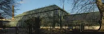 300 ft. long, 45 ft. wide and 50 ft. high, the building is fully glazed on the roof and the south face, while the north face is walled up. With a total floor space of 14,000 sq. ft., the interior is divided lengthwise into three sections; there are two annexes to the central section, namely a plant-rich east wing which serves as the entrance hall, and a west wing used as a coldhouse.