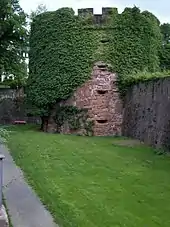 The irregular 7m high and 1.8m thick wall was constructed to defend the southern and western approaches to the town, and today is bordered by the public walkway "the back walk" |
