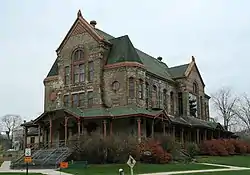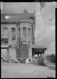 Prominent Milwaukee architect Henry C. Koch designed Ward Memorial Hall in the High Victorian Gothic Revival and Romanesque Revival styles, with a theater/meeting room, commissary store, restaurant, and railroad passenger station.[3] This unusual combination of building uses was to serve the growing recreational needs of the Milwaukee Soldiers Home.[3] It has a wide veranda wrapping around three sides.