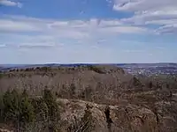 View looking south from the top of West Peak in Meriden, Connecticut. Sleeping Giant State Park can be seen.