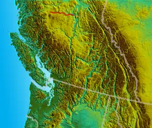 The river is 280 km (170 mi) long, draining an area of approximately 12,000 km2 (4,600 sq mi), and dropping over 900 m (3,000 ft) before joining with the Fraser.[3]