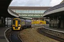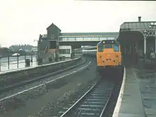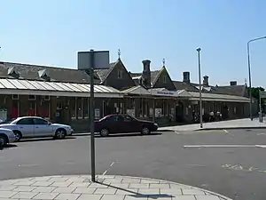 The station itself was refurbished in 1986 with a new booking office.[4] A few years later the canopy was renewed. This saw the removal of a few bays of the canopy at the east end of the station, and the replacement of the hipped canopy by a simpler modern design, although the original cast iron columns support this. Some hipped bays remain on the road side of the station entrance as a reminder of how it all once looked.