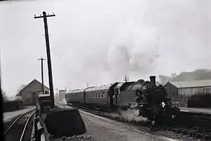 LMS Ivatt Class 2 2-6-2T No. 41329 passes the station in the 1960s.