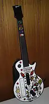 The Wii version of Guitar Hero III: Legends of Rock is bundled with a white Gibson Les Paul-style guitar controller. It includes a slot for the Wii Remote to fit into, though the Wii Remote Jacket must be removed first, and utilizes the wireless capabilities, accelerometer, rumble feature and speaker of the Wii Remote.[33] It also features an analog stick that can be used to navigate the Wii Menu. Like the PS3 and Xbox 360 guitar controllers, the Wii Les Paul can be customized with detachable faceplates. The Les Paul also comes with the special edition of Guitar Hero: Aerosmith which includes an Aerosmith-themed faceplate. The Gibson Les Paul controller is also available for purchase separately from the game.