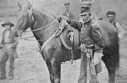 Gibson entered service July 31, 1861, and by August 31 was named Colonel of the Forty-Ninth Regiment, Ohio Volunteer Infantry.[32] Gibson was the 49th Ohio Infantry's commanding officer throughout the U.S. Civil War. In August and September 1861, he organized and trained the 49th Ohio Infantry at Camp Noble, near his home in Tiffin, Ohio. With Gibson in command, the regiment was mustered for three years and fought at 42 Civil War battles including: the Battle of Shiloh, the Siege of Corinth, the Battle of Stone River, the Tullahoma Campaign, the Battle of Chickamauga, the Battle of Missionary Ridge, the Atlanta Campaign, the Battle of Resaca, the Battle of Kennesaw Mountain, the Siege of Atlanta, the Battle of Jonesboro, the Second Battle of Franklin, and the Battle of Nashville.[33][34]