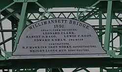Prior to its construction, a "free bridge at Willamansett" was discussed at least as early as 1886, with the Commonwealth's committee on roads and bridges visiting the site in an official capacity on March 18, 1886.[2] The bridge was built in 1891 by Richard F. Hawkins Ironworks[3](superstructure) and Wright Lyons and Company (substructure) with Edward S. Shaw as engineer[4] at an original cost of $178,326.69.[5]