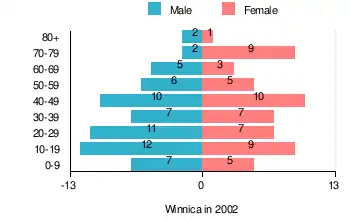 According to the 2002 Poland census, there were 118 people residing in Winnica village, of whom 52.5% were male and 47.5% were female. In the village, the population was spread out, with 26.3% under the age of 18, 36.4% from 18 to 44, 20.3% from 45 to 64, and 16.9% who were 65 years of age or older.[1]