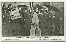Elizabeth Wilks, who was the treasurer of the league, refused to pay her tax in 1908.[4] Married women were not required to pay tax in Britain at that time. According to the law, the joint income of a couple was added together and the husband paid the tax. However, Elizabeth, who earned more than her husband, refused to tell her husband, Mark Wilks, how much she earned. This put the authorities into a quandary, as Elizabeth was not liable to pay tax and her husband said he was willing to pay the tax but had no idea how much to pay.[5] In 1910, the authorities illegally seized some of Elizabeth's goods in an attempt to levy the tax on her income. The authorities then tried to claim the tax as coming either from both Wilkses or from Mark Wilks alone. This was legally unsatisfactory, as Mark Wilks was being asked for tax on an income of about £600 per annum that he was nominally unaware of. Subsequently, 3,000 teachers signed a petition when Mark Wilks was placed in Brixton prison, and there was a demonstration in Trafalgar Square to protest his treatment. He was released after a fortnight to celebrations from the supporters of the Women's Tax Resistance League,[6] which included George Bernard Shaw.[4]