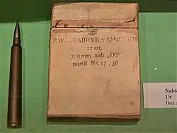 The DS ammunition was originated from the standard 7.92×57mm cartridge as used by both the Mauser rifle 1898 (wz.98) and its Polish variant the Karabinek wz.29. The length of the cartridge was extended to 131.2 millimetres (5.17 in) and the overall weight was 64.25 grams (2.266 oz). After an additional series of tests the copper cartridge case was replaced with a case made of brass (67% copper/ 23% zinc).