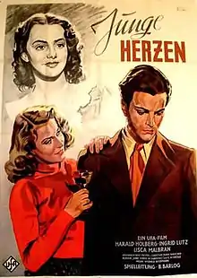 Young Hearts (German: Junge Herzen) is a 1944 German drama film directed by Boleslaw Barlog and starring Harald Holberg, Ingrid Lutz, and Lisca Malbran.[1] The film's sets were designed by art director Anton Weber. It was made by German's largest studio of the era UFA. The film was shot at the Babelsberg Studios and at the Hostivar Studios in Prague.[2]